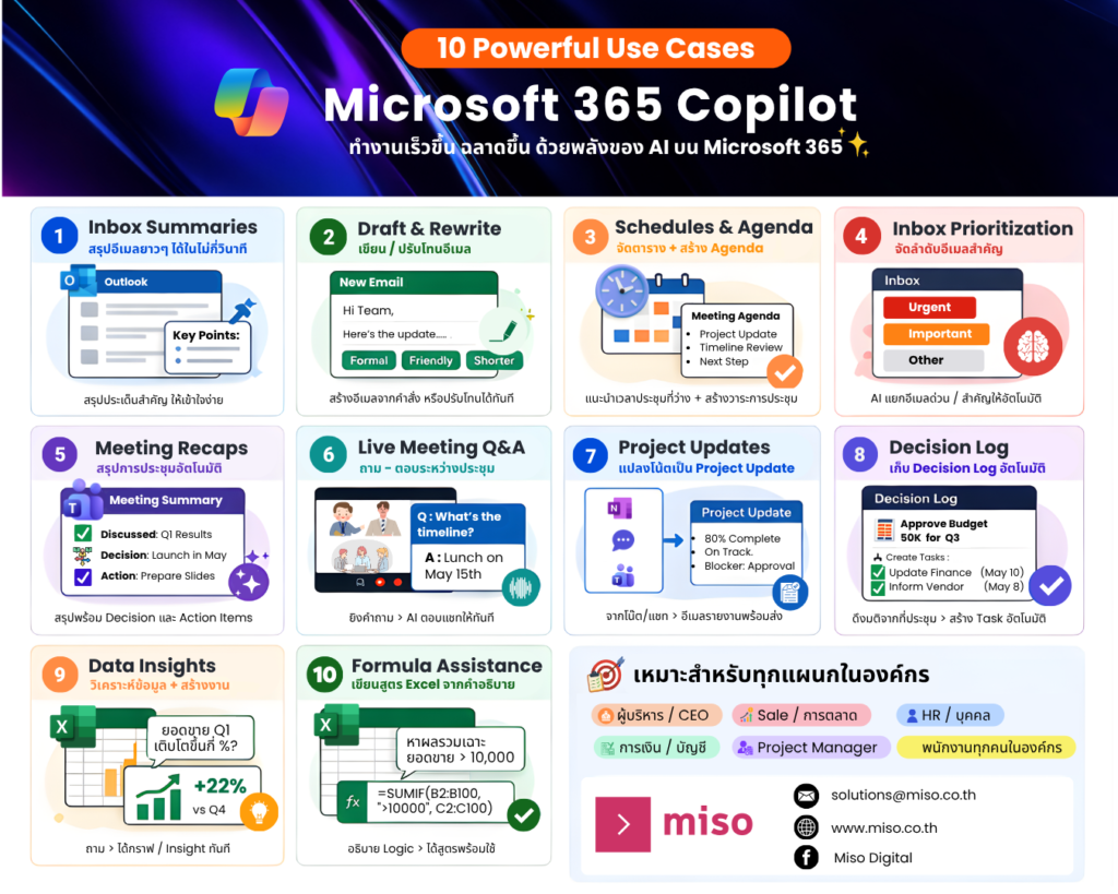 ผู้ช่วย AI ที่ยกระดับการทำงานของคุณทั้งองค์กร ที่ถูกผสานเข้ากับเครื่องมือที่คุณใช้งานทุกวัน เช่น Word, Excel, Outlook และ Teams เพื่อช่วยให้การทำงานเร็วขึ้น แม่นยำขึ้น และมีประสิทธิภาพมากขึ้น