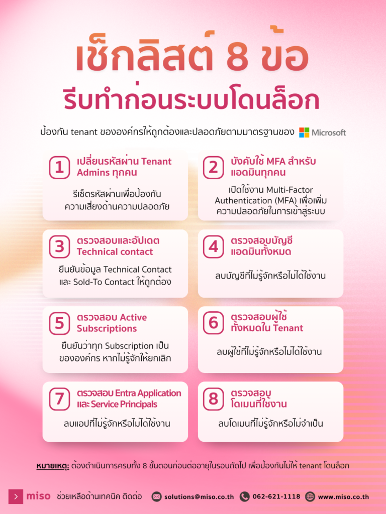 และเพื่อให้มั่นใจว่า Tenant ของคุณจะไม่ถูกระงับการใช้งานก่อนการต่ออายุ License Microsoft 365 รอบถัดไป MISO จะพาทุกคนมาทำเช็กลิสต์ทั้ง 8 ข้อให้ครบถ้วนว่าต้องตรวจอะไรบ้าง และทำไมจึงสำคัญต่อความปลอดภัยขององค์กร