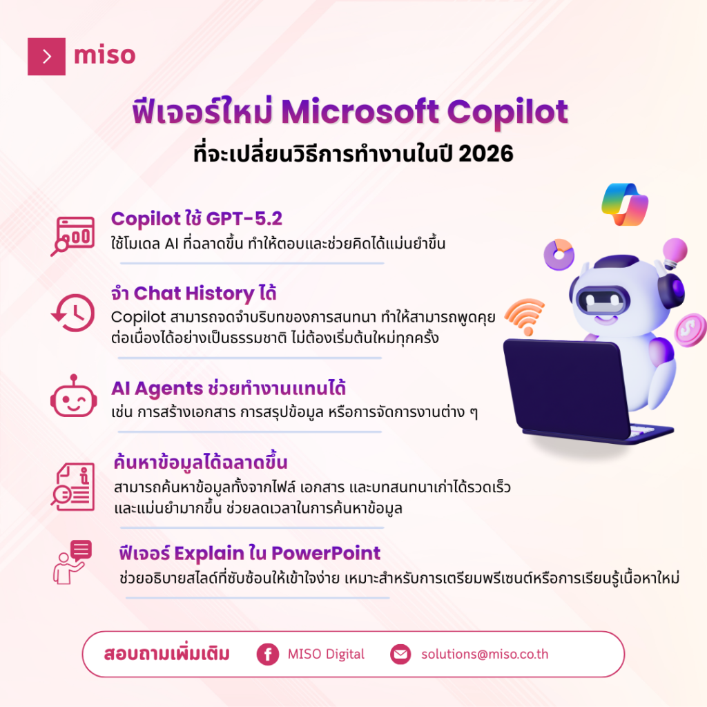 จากการอัปเดตล่าสุดในปี 2026 Copilot ได้เพิ่มความสามารถใหม่หลายด้าน ทั้งในเรื่องความฉลาดของ AI การเข้าใจบริบท และการทำงานร่วมกับเครื่องมือใน Microsoft 365 ได้ลึกยิ่งขึ้น
