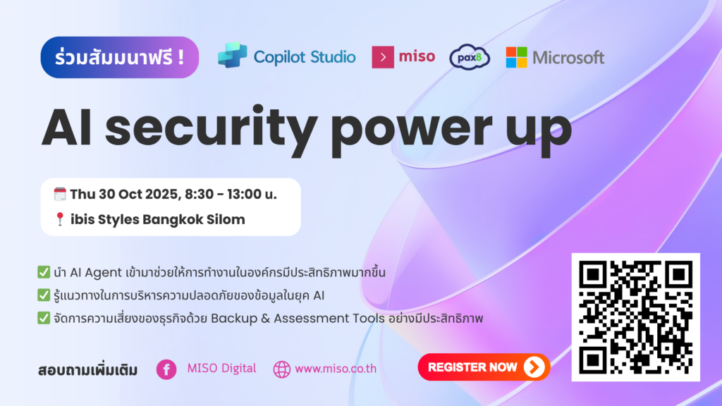 เมื่อวันที่ 30 ตุลาคม 2025 MISO Digital ได้จัดงานสัมมนา AI Security Power Up ณ ibis Styles Bangkok Silom เพื่ออัปเดตเทคโนโลยีล่าสุดด้าน AI และ Cybersecurity ให้แก่ผู้บริหารและผู้ปฏิบัติงานด้าน IT และ AI โดยมุ่งเน้นการบริหารความปลอดภัยของข้อมูลองค์กรและการสร้าง AI Agent เพื่อเพิ่มศักยภาพธุรกิจในยุคดิจิทัล