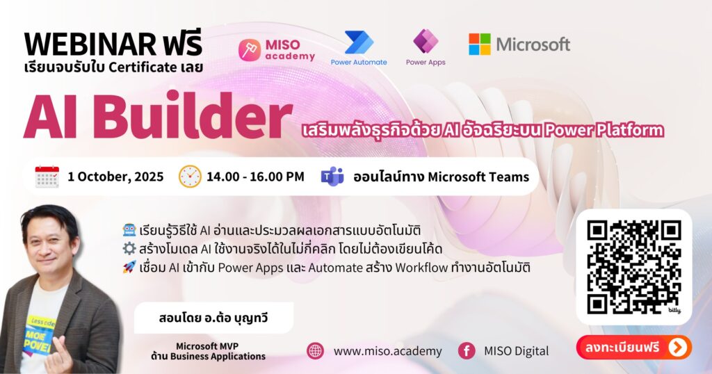 ในวันที่ 1 ตุลาคม 2025 MISO.academy ได้จัด Webinar “AI Builder” ผ่าน Microsoft Teams เพื่อให้ผู้เข้าร่วมได้เรียนรู้การใช้งาน Microsoft AI Builder ในการสร้างโมเดล AI โดยไม่ต้องเขียนโค้ด พร้อมแนวทางการนำไปใช้จริงในองค์กร