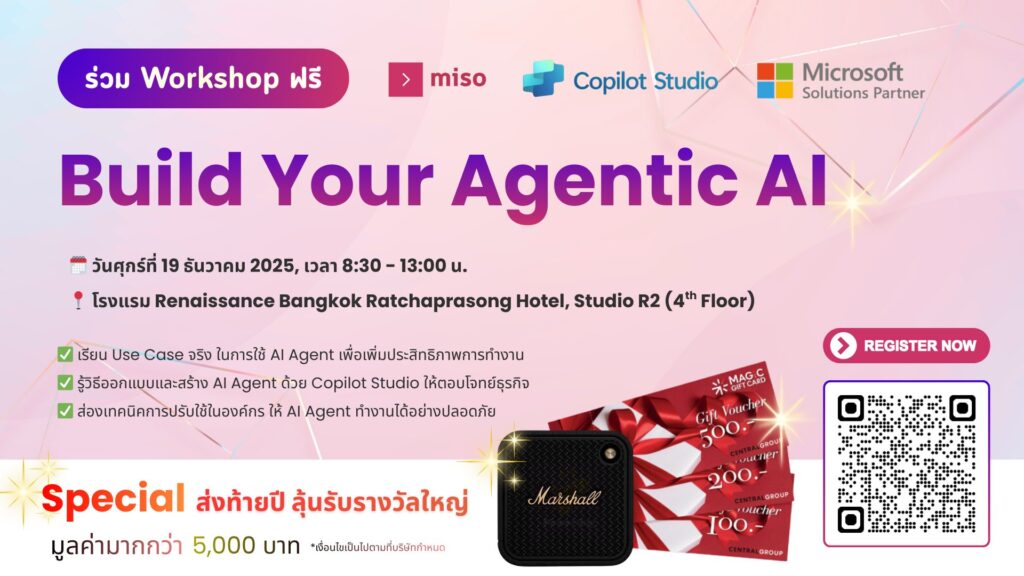 เมื่อวันที่ 19 ธันวาคม 2025 บริษัท MISO Digital จัด Workshop สุดพิเศษ “Build Your Agentic AI” ณ โรงแรมเรอเนสซองซ์ กรุงเทพ ราชประสงค์ เพื่อพาผู้บริหารและทีม IT ก้าวสู่ยุคใหม่ของการทำงานด้วย Agentic AI บนแพลตฟอร์ม Microsoft 365 Copilot และ Copilot Studio