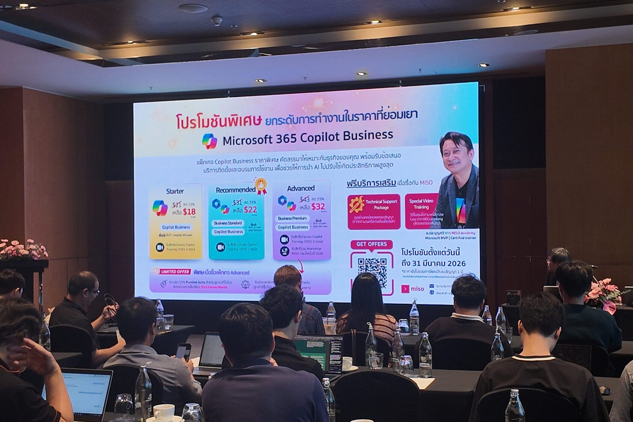 อีกหนึ่งไฮไลต์สำคัญในงานคือ Session สาธิตการใช้งาน Microsoft 365 Copilot และ Copilot Studio โดย อ.ต้อ บุญทวี Microsoft MVP และวิทยากรจาก MISO.academy ซึ่งนำเสนอวิธีการสร้าง AI Agents ที่เชื่อมต่อกับข้อมูลองค์ความรู้และปรับใช้กับ Workflow ขององค์กร เพื่อเพิ่มประสิทธิภาพและความคล่องตัวในการทำงาน